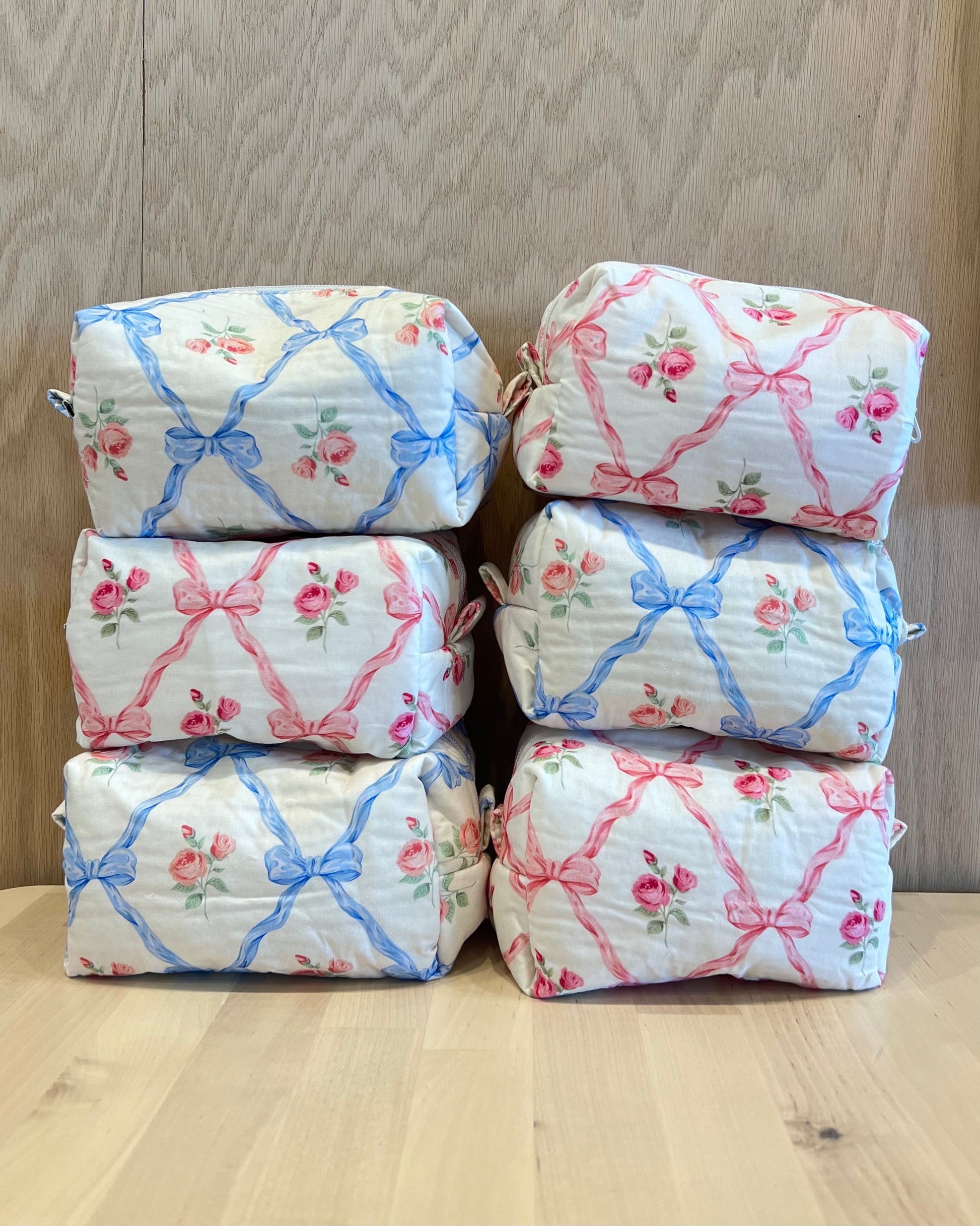 elevate your essentials with our handcrafted 100% cotton pouch in white with blue ribbons and roses.
