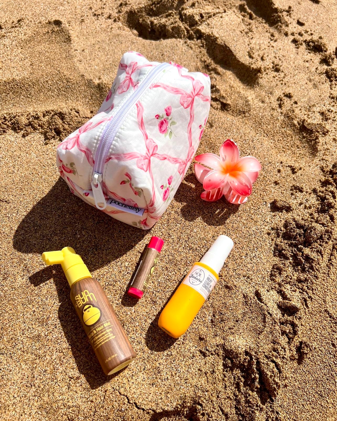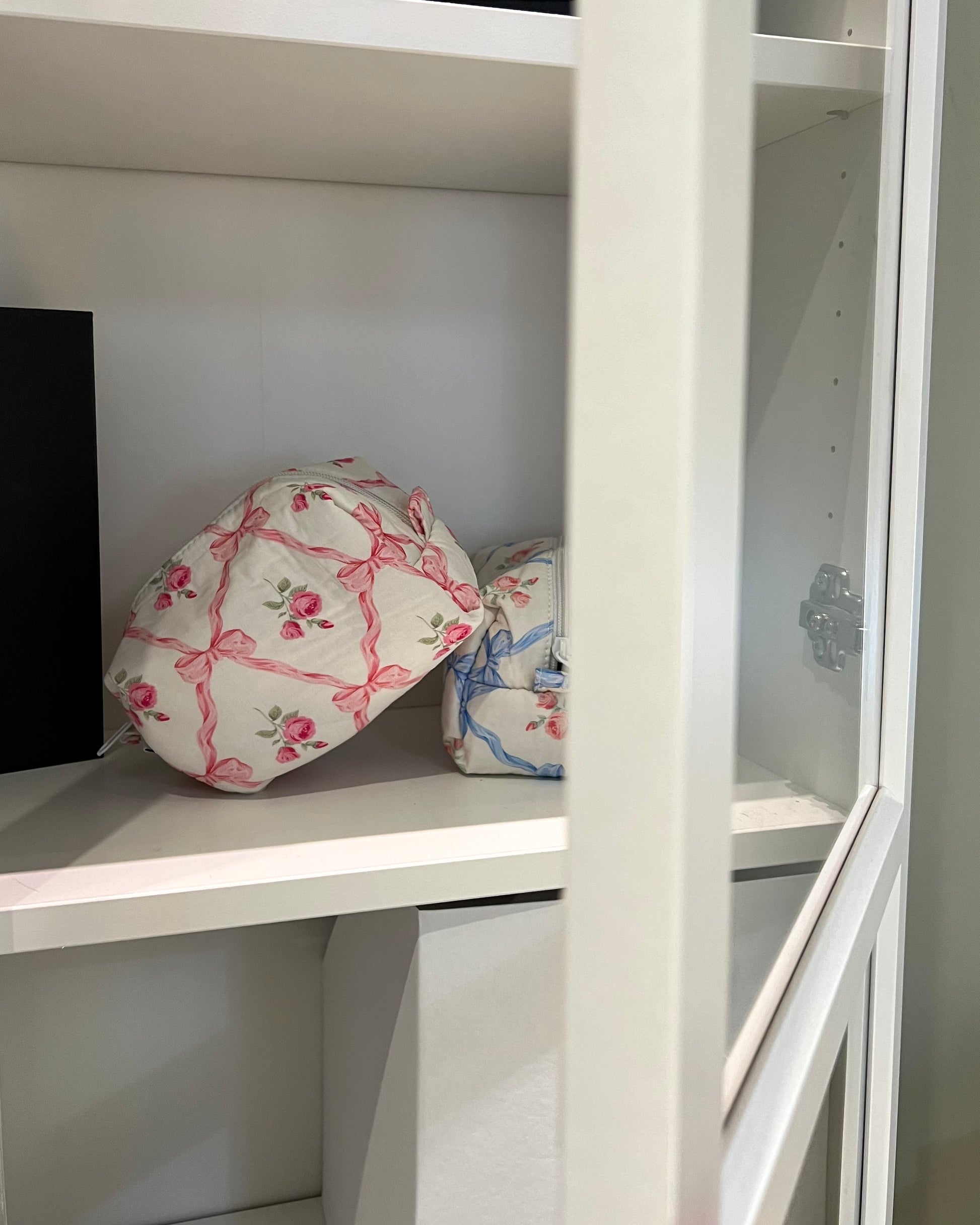 elevate your essentials with our handcrafted 100% cotton pouch in white with pink ribbons and roses.