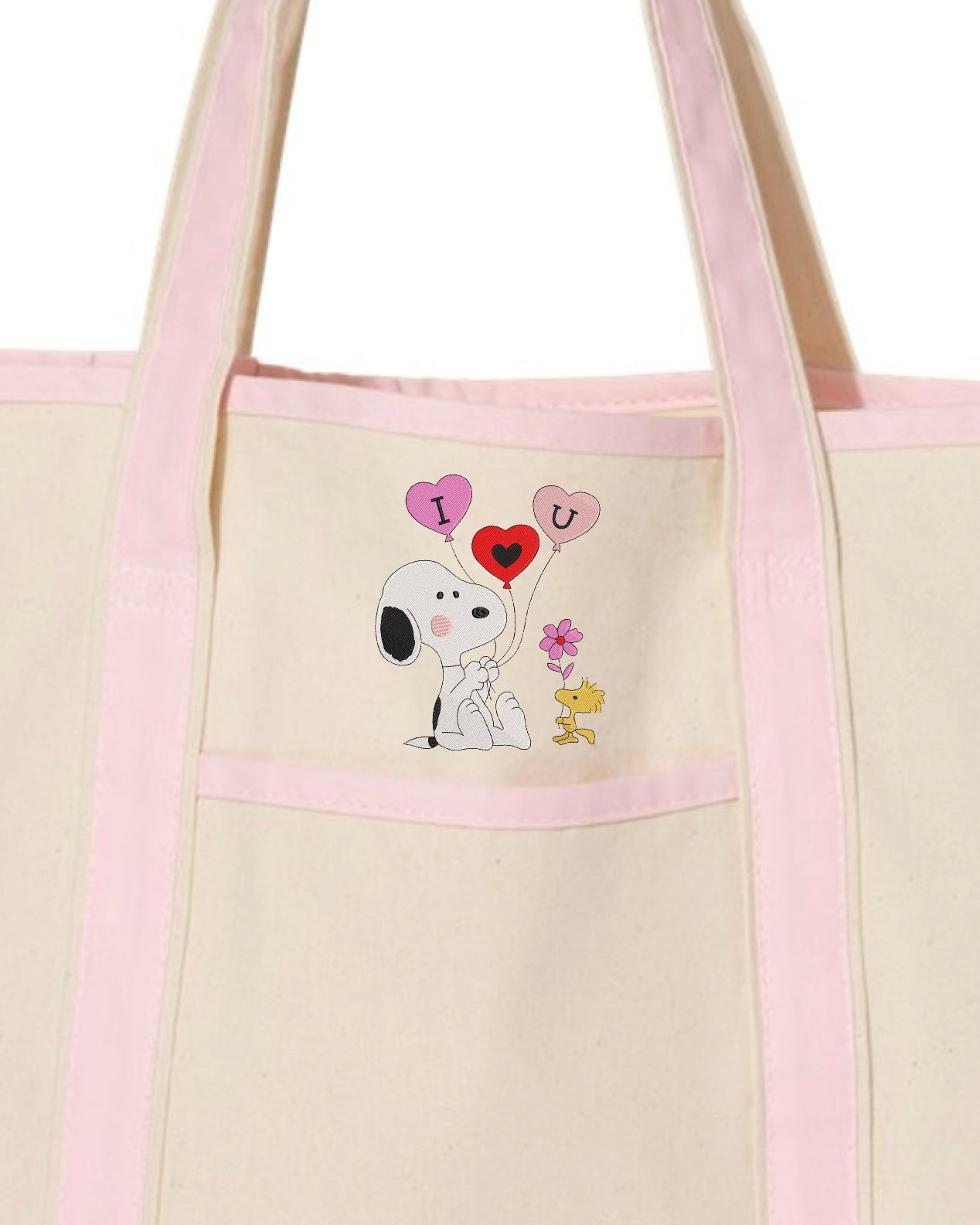 snoopy & woodstock are on their way to spread love! your new go-to tote, featuring an embroidered snoopy & woodstock on a bicycle OR with heart shaped balloons.