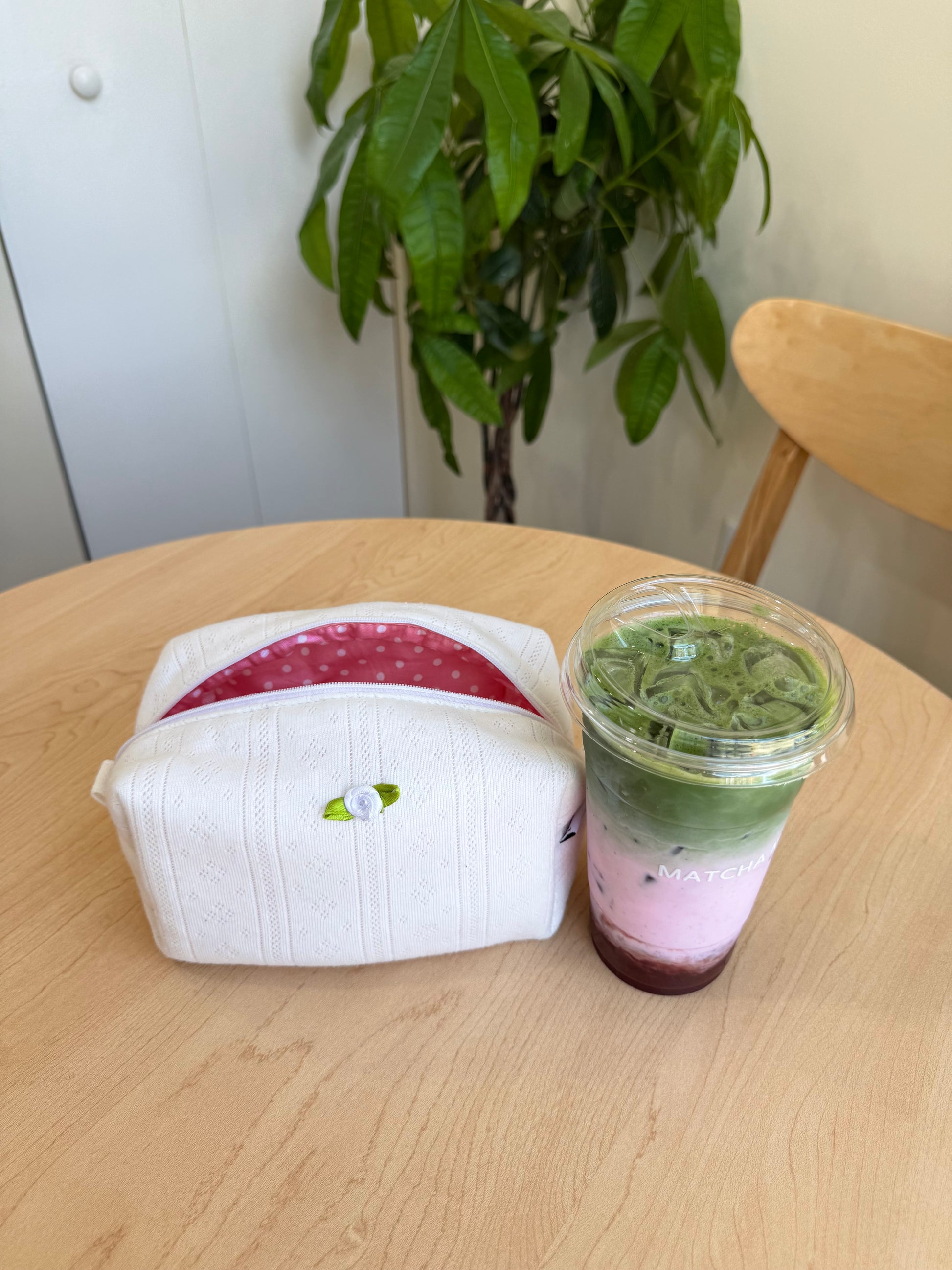 made with jenny ha—meet strawberries & cream. handcrafted 100% cotton pointelle pouch with pink polka dots peeking inside and a soft rose accent.